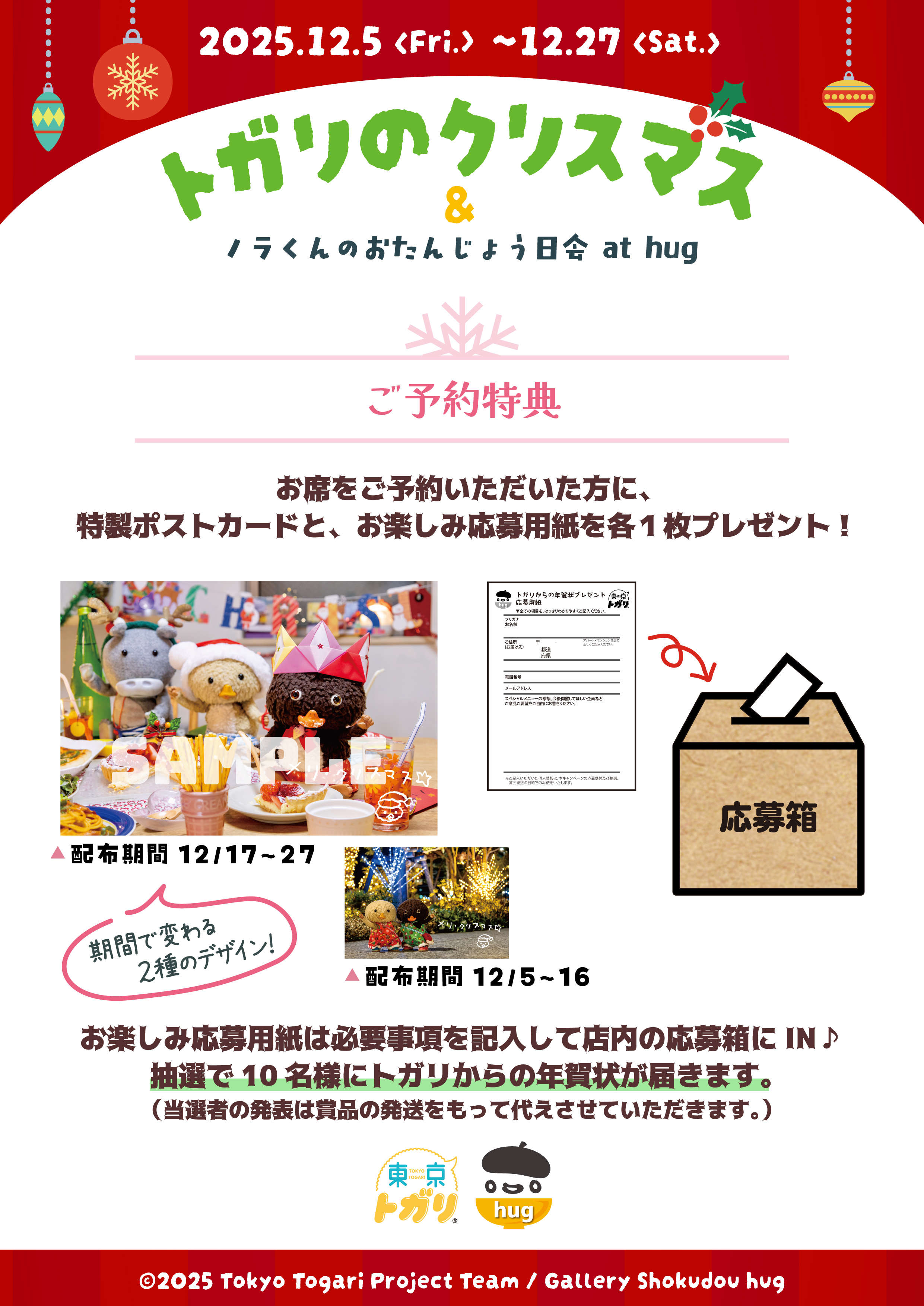 2025年12月5日(金)より、東京・中野にある「カラダよろこぶ発酵ごはん」がテーマのギャラリー食堂hug にてトガリのクリスマスコラボ食堂「トガリのクリスマス&ノラくんのおたんじょう日会 at hug」を開催いたします。